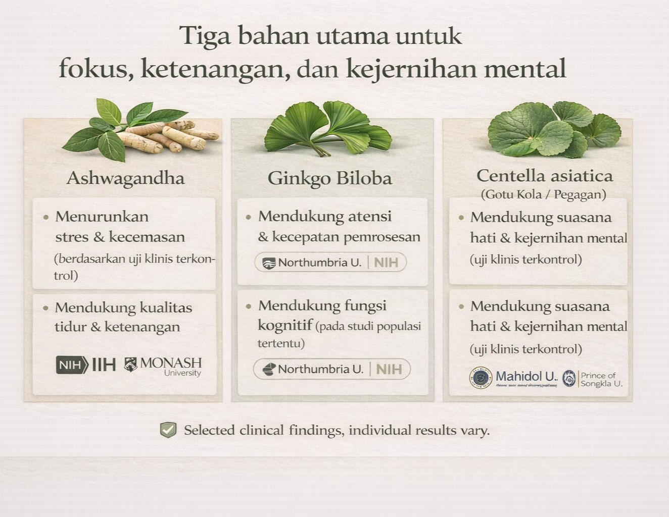 Mendukung fungsi kognitif & sirkulasi, membantu kejernihan berpikir saat bekerjaCentella